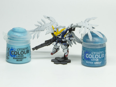 今回は手描きのアクリルガッシュで塗ったような質感を目指し、ゲームズワークショップが販売するシタデルカラーを使い、本製品のうち「ウイングガンダムゼロ EW」を塗装する。シタデルカラーはカバー力が高く塗りやすいベースカラー、カバー力は低いが鮮やかな色を塗れるレイヤーカラー、ウォッシングやスミ入れに使えるシェイドカラーを使用する。これらを使うことで、細やかな色彩を表現する。