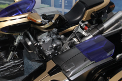 「S.H.Figuarts サイドバッシャー」は、別売りの「S.H.Figuarts(真骨彫製法)仮面ライダーカイザ」のスケールに合わせて設計されていて、ビークルモードの全長は約210mmとかなりのボリュームを誇る。バイクのミニチュアとしてのクオリティもかなり高く、ゴールドとブラックのツートンカラーの塗装や、エンジンなどメカ周りの造形もかなり高いクオリティで仕上がっている。各所のマーキングは全てタンポ印刷で再現している。