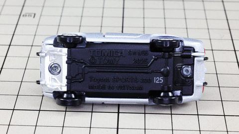 トミカプレミアムでは実車の純正ホイールも忠実に再現しているところにも注目です。ヨタハチのシルバーのディッシュ型ホイールを忠実に再現!クルマのキャラクターと出力との兼ね合い、当時の雰囲気を漂わせる細いタイヤにも注目です。トミカプレミアムをひっくり返してシャーシ側を見てみるとシャーシのフロント側が車体と同色で塗装されていることがわかります。実車でも下面のある程度までボディーカラーが回り込んでいることからそのイメージを大切にしている処理だということがわかります。
