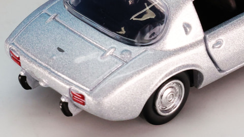 コンパクトなキャビンを実現するために程よく立てられたフロントウインドウは左右に湾曲しています。トミカプレミアムでは外すことができませんが実車では取り外すことができるルーフをブラックの塗装で表現しています。ルーフトップからかわいいアールを描いてリアエンドにつながるラインを指でなぞってみるとリアウインドウとトランクフードでのアールの違いを感じられます。リアエンドにあるこれまたかわいい灯火類もチェックしておきたい部分です。