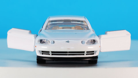 左右ウインドウ周囲を囲うように配置されたメッキモールはシルバーの塗装で表現してあります。ボディーカラー・ブラックではより際立ちホワイトでもくっきりと確認できて、ここでも高級感を漂わせています。そのボデイ左右は前後に一直線のシャープなキャラクターラインがプレスされますがトミカでもくっきり判別でき、スピード感も感じられるほどです。