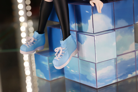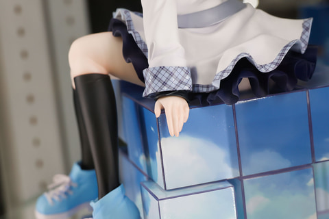 こちらも元のイラストで描かれていたものだが、空が描かれたルービックキューブのような物体の上に腰掛けているような姿になっており、角の辺りに手を置いているようなポーズも自然だ。足には黒いソックスや空と同じ色をしたシューズを履いており、こちらも制服に合っている。
