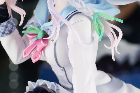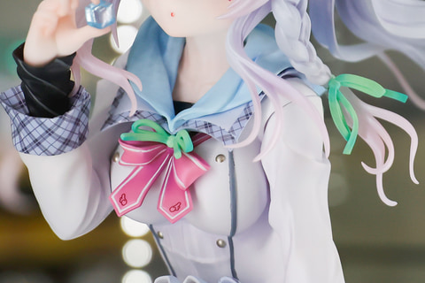 淡い色合いをした髪だが、こちらはファンシーな色味でグラデーションがかけられている。正面からは少しわかりにくいが、束ねた髪がふんわりと風でなびいているように浮かんでいるようだ。特に毛先の部分は若干透き通るような質感になっており、こちらはクリアパーツを使用して表現している。