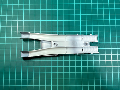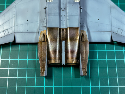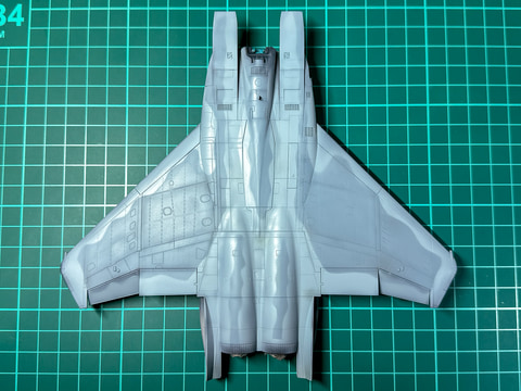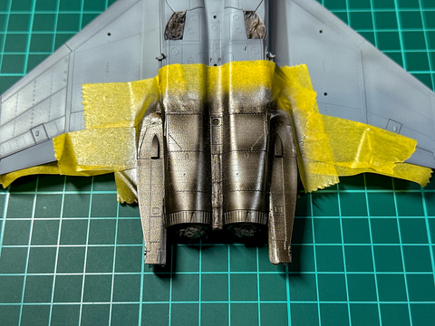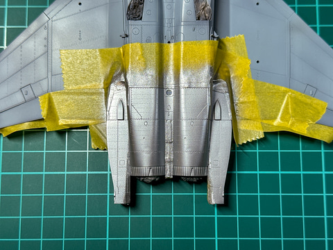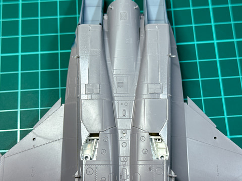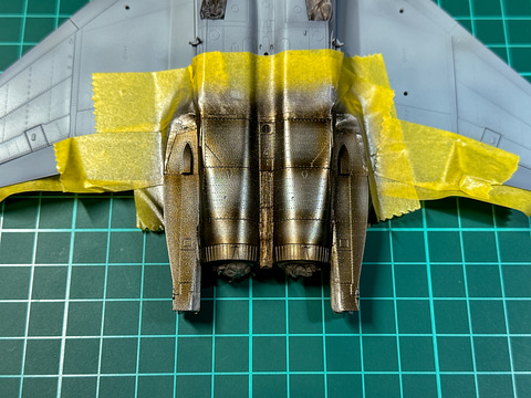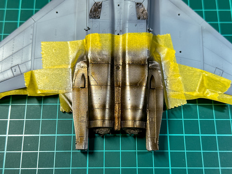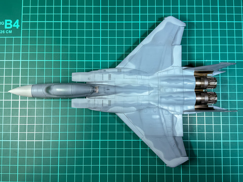 F-15のエアインテーク口はコックピットとの間に隙間があるので、組み立て後には塗装が難しい部分です。一部外装だけ先行で塗装しておきます。この塗装方法については後述の外装塗装時にまとめて説明します。
