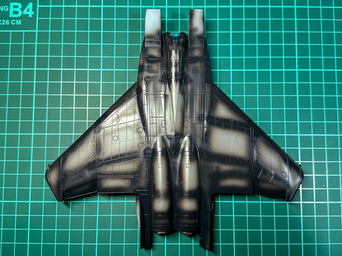 機体のベースとなるF-15の迷彩塗装は型紙を使用して塗り分けます。最初に機体の陰影を強調するため、ガイアノーツの「ニュートラルグレーⅤ」を使用してプレシェードを塗装します。プレシェードの塗装箇所は、機体の端部やモールドライン、逆エッジ部分のみです。