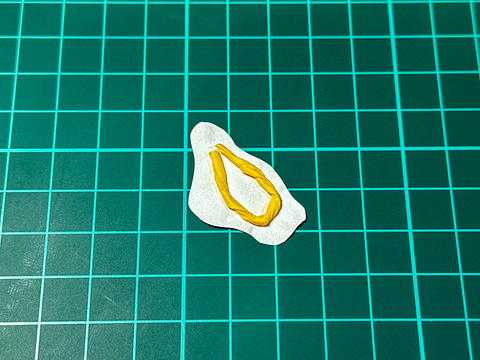 1色目の塗装後は迷彩柄の型紙を作成します。説明書を拡大コピーしたものを型紙として2色目を塗布します。この型紙は本体に密着させず、こより状にしたマスキングテープを使用することで塗り分けの境界にボケ脚をつけることができます。
