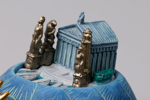体全体は砂漠のような色合いになっているが、頭の上には暑い場所には欠かせない帽子を被っている。また、背中のジオラマ部分には、遺跡のようなものが並んでいるところもユニークだ。さらにその上にはUFOが飛んでおり、キャトルミューティレーション時の光線のようなものを放っているなど、まさにイメージ通りの世界観が広がっている。