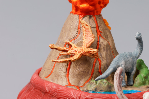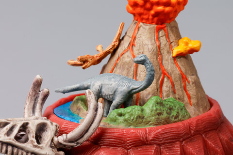 頭の部分には、恐竜の化石のようなものを被っている。また、背中のジオラマでは、火山が噴火している様子や、アパトサウルスといった恐竜や翼竜の姿なども再現されている。実物はかなり小さいのだが、それでもこれだけの世界観を表現しているのは素晴らしい。