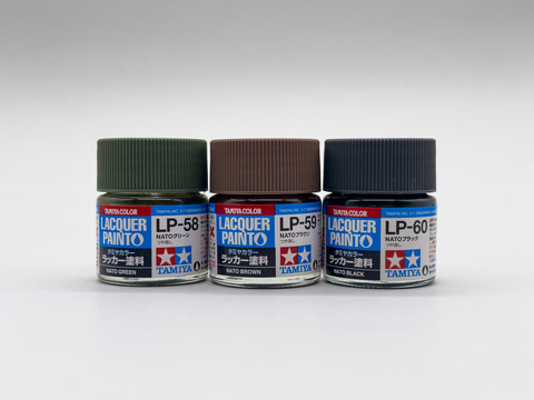 今回の作例ではキットの改造等は行なわず、本体の塗装後は軽めにウェザリングを施して仕上げます。基本塗装にはタミヤラッカーのNATOカラー3色である「NATOグリーン」、「NATOブラウン」、「NATOブラック」を使いました。