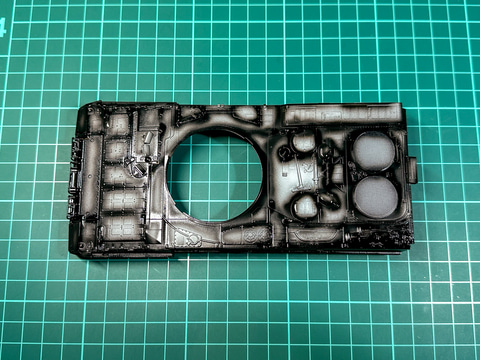 最後にウォッシングを複数回行ない全体的な色味を調整します。最初のウォッシングはスミ入れを兼用し、クレオスの「Mr.ウェザリングカラー マルチブラック」を使います。ウォッシング後の車体は色味が暗くなり重量感が増しました。