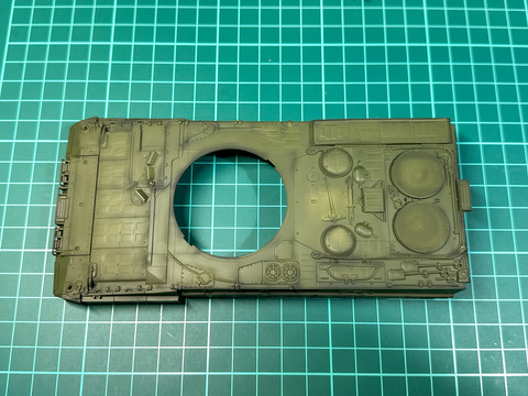 戦車キットの組み立ては、塗装に支障がない範囲でできる限り多くのパーツを取り付けてしまいます。今回の作例では車体下面、車体上面、砲塔、砲身、履帯、その他に分けて組み立てを行ないました。