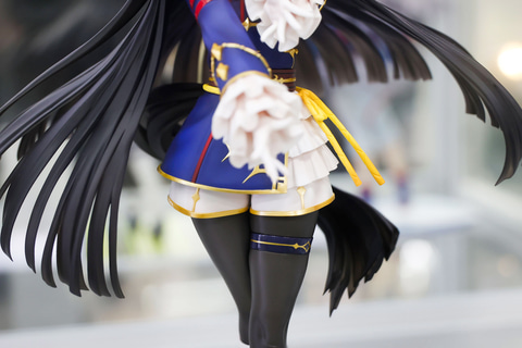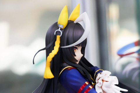 勝負服の下半身部分は、白いパンツに金の縁取りが付けられたものだ。そこから黒いタイツをはいた脚がスラリと伸びている。台座は、カルストンライトオが好きな直線で構成されているほか、猫の意匠がワンポイントで付けられているところも面白い。