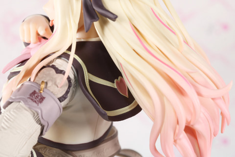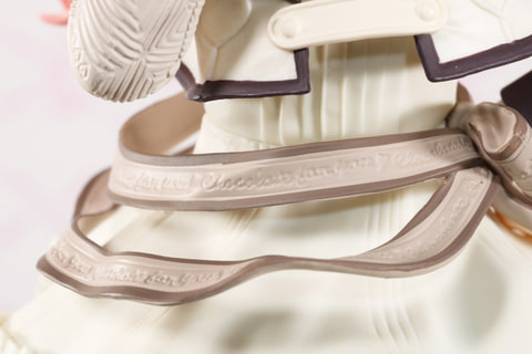 ホワイトチョコを連想させる色合いはもちろん、上着のハートマーク、袖の板チョコ風の模様、そして腰のリボンとバレンタインらしい意匠がしっかりと造形され存在感抜群。左腕についている腕章のデザインプリントやピンのゴールド塗装も色分けされている。