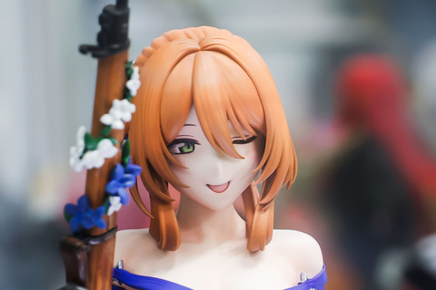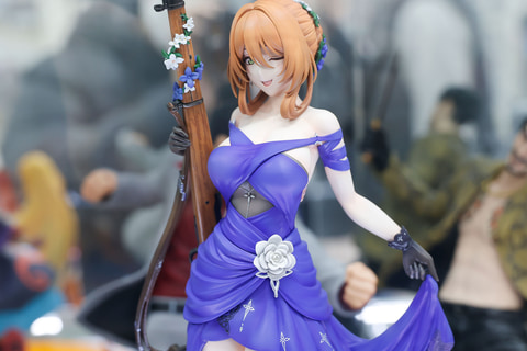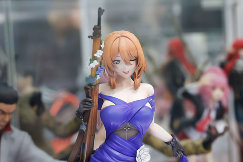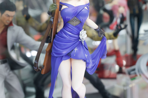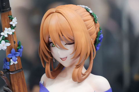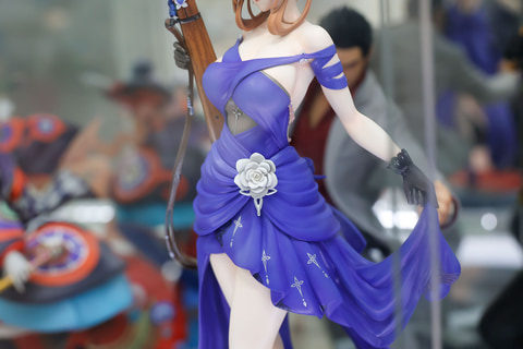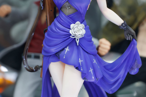 長い髪は、シニヨンでコンパクトにまとめられており、こちらにはドレスの色合いに合わせて、紺色と白の花飾りが付けられているところがおしゃれだ。手にはキャラクターのモチーフとなったライフルを携えており、こちらにも髪飾りと同じ花があしらわれているのは面白い。