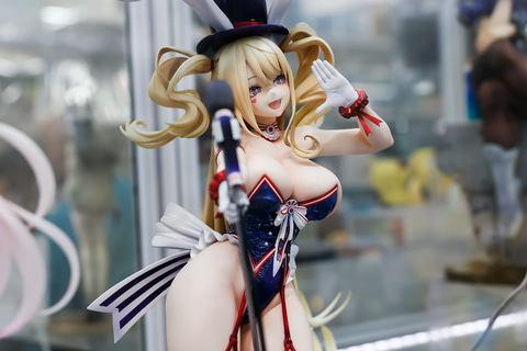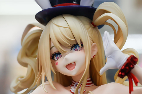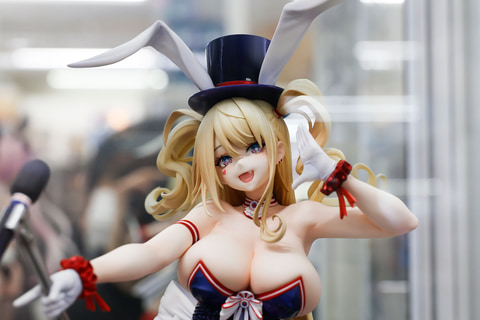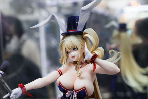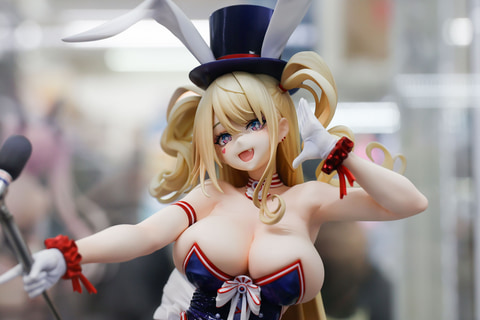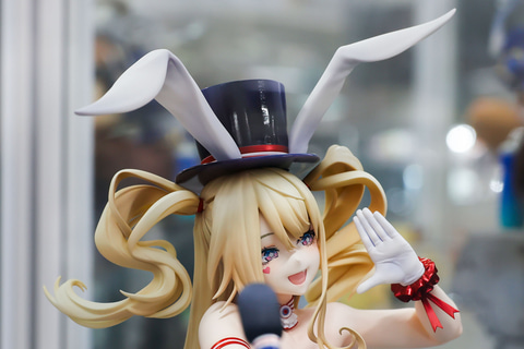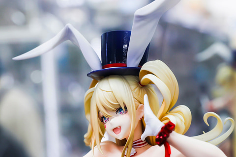 バニースーツをベースにした衣装ということもあり、頭の上には大きめのハットとうさ耳が付けられている。足元まで伸びた金色の長い髪は、風の影響か横に流れるようになびいており、前に垂れた髪も少しカールしているなど、造形も見事だ。