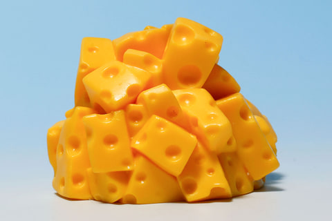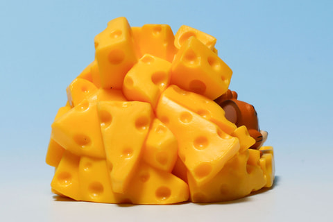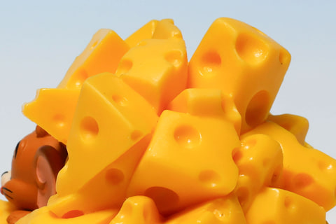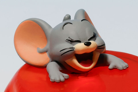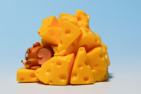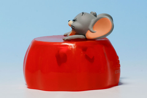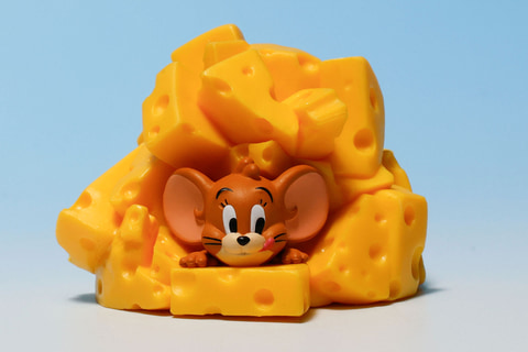 トムが食器にまみれているのはやや不幸だが、こちらの「チーズにまみれるジェリー」は、むしろラッキーに見えるのが不思議だ。色鮮やかな黄色いチーズにすっかり埋もれてしまっているジェリーだが、むしろ居心地が良さそうだ。