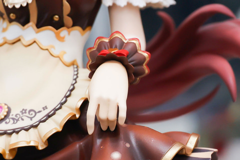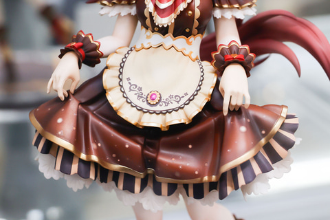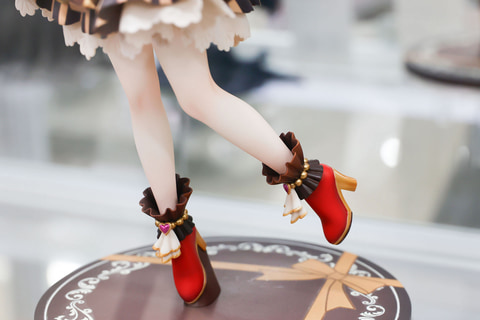 両手でスカートを持ち上げて、片足で立っているようなポーズもかわいらしい。お菓子のラベルを連想させるようなエプロンや、複数重ねられたスカート部分などのデザインは秀逸だ。台座部分はシンプルなデザインで、こちらもチョコをイメージしたようなスタイルが採用されている。