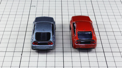 それでは全体を見ていきましょう。パッケージから取り出すと意外とがっちりしたスタイルに驚きます。通常仕様と初回特別仕様で大きく違いがあり、それはリアウインドウにルーバーがあるかないかとなっています。実車ではこの専用リヤガラスルーバーはメーカーオプションとなっているものです。通常仕様のグレーとルーバーありとの組み合わせ、初回特別仕様のレッドとルーバーなしの組み合わせが楽しめます。