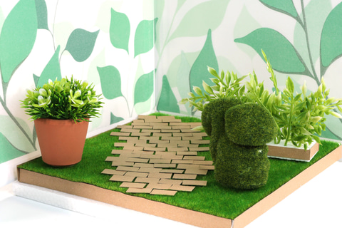 背景は組み立てパネルと窓のインテリア商品を組み合わせることで、緑豊かな背景を表現することができた。そして、土台は「フェイクモスシート」で簡単に芝生を表現でき、簡単な工作で作れるのも魅力となっている。少し手を加えることで、石畳などのアレンジもできる。