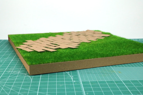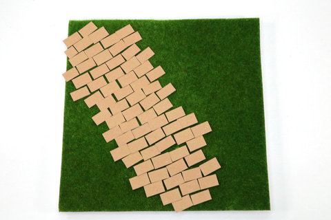 接着する際は「フェイクモスシート」のチップを敷く箇所をミニばさみなどで少し芝を整え、「速乾ボンド(クラフト用)」でチップを敷き詰めていく。このままだと浮き上がってしまうので、ある程度敷き詰めたら上に重しを置くなどして圧力をかけて接着していく。これを何度か繰り返して、レンガ風の石畳を作る。