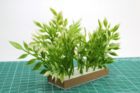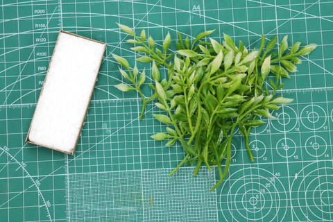 完成したパーツを好きに配置すれば、庭園風ジオラマの完成だ。背景との段差が気になる時は余っている発泡板で高さを調整しよう。