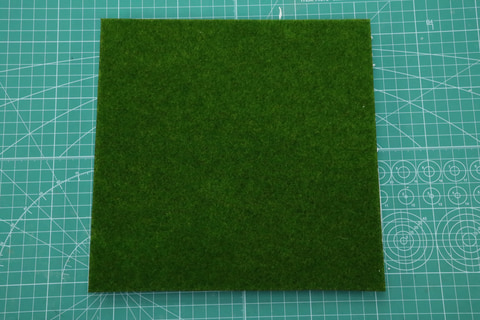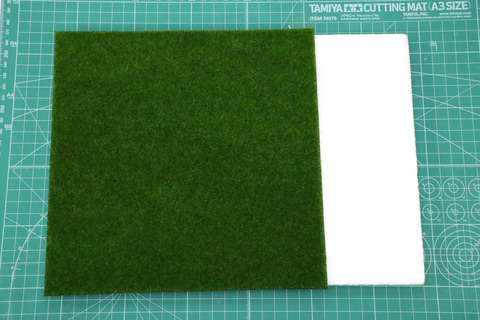 今回は芝生を作成していく。こちらは「発泡なんでも板 A4」と「フェイクモスシート」を組み合わせる。まず、フェイクモスシートを発泡板にあて、余分な部分をカットする。そして、発泡板にジオラマ向けのボンド「速乾ボンド(クラフト用)」で接着する。