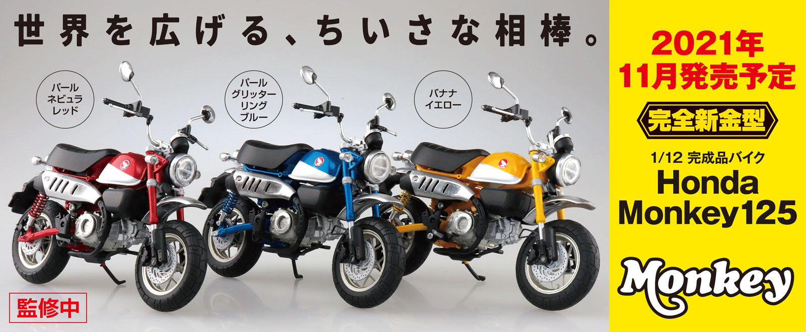 アオシマ、SKYNETブランドよりバイク「Honda モンキー」1/12スケール完成品モデル3種を10月に発売!