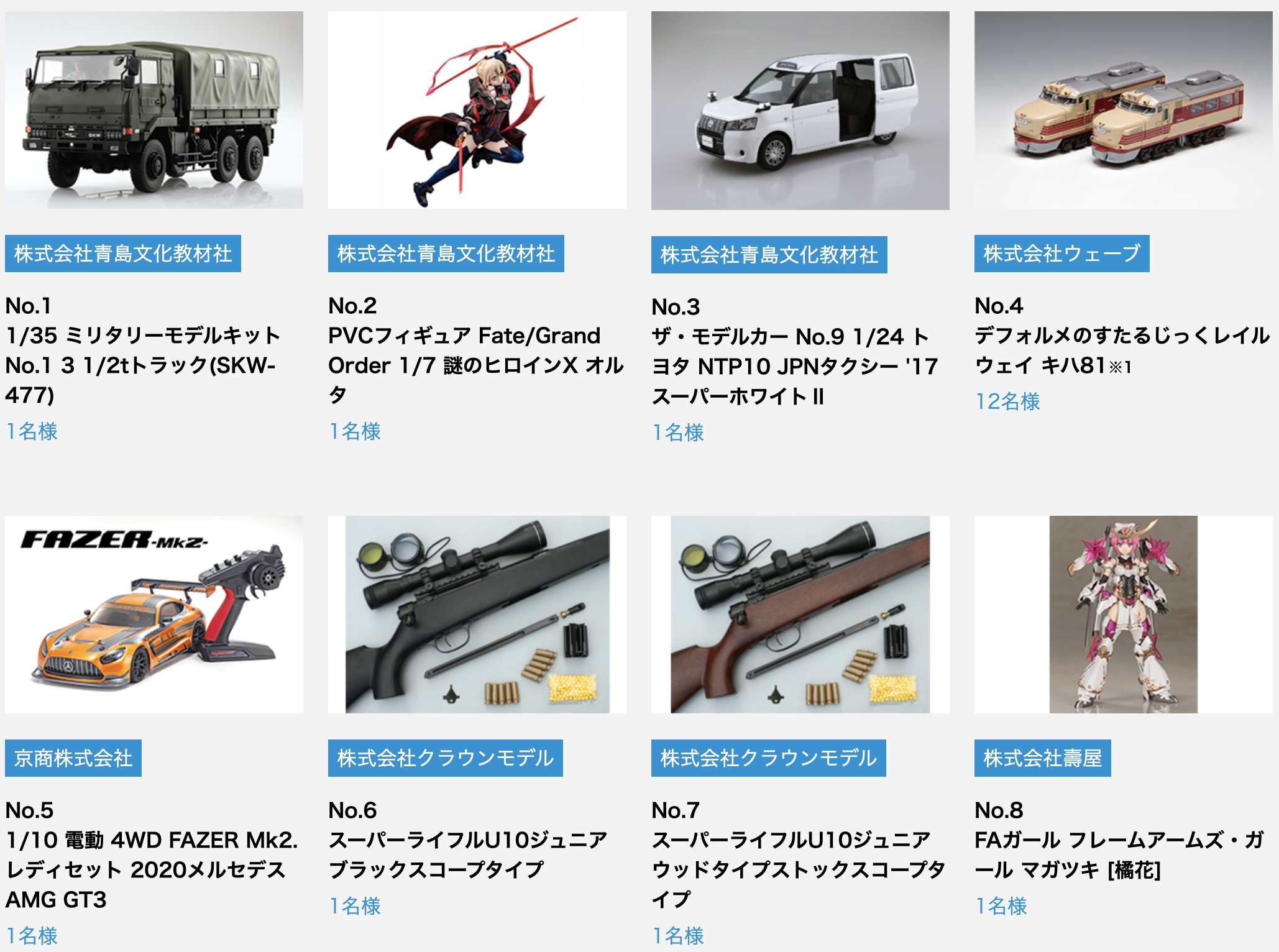 ©TYPE-MOON / FGO PROJECT ©KOTOBUKIYA ©KOTOBUKIYA・RAMPAGE ©Masaki Apsy ©TOKYO MARUI Co.,Ltd. All rights reserved.  ©サンライズ ©Licensed by ISUZU ©高千穂&スタジオぬえ・サンライズ ©2021 SUNRISE BEYYOND INC. (C) GIRLS und PANZER Projekt  (C)GIRLS und PANZER Film Projekt   (C) GIRLS und PANZER Finale Projekt