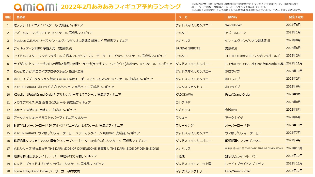 通販サイト「あみあみ」の「2022年2月あみあみフィギュア月間ランキング」が発表(2/12)