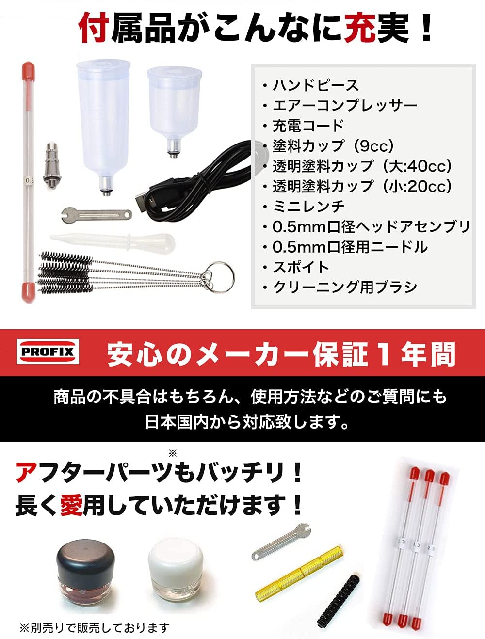 • RAYWOOD PROFIX エアブラシ TS1-B02 ハンドピース 付きコンプレッサー セット USB 充電式 ダブルアクション 自動電源 オートスイッチ カップ(20cc,40cc) クリーナー 5本 付き 口径0.3mm 0.5mm ノズル ニードル 付き 小型 プラモ 模型 塗装 アート クラフト (シルバー)