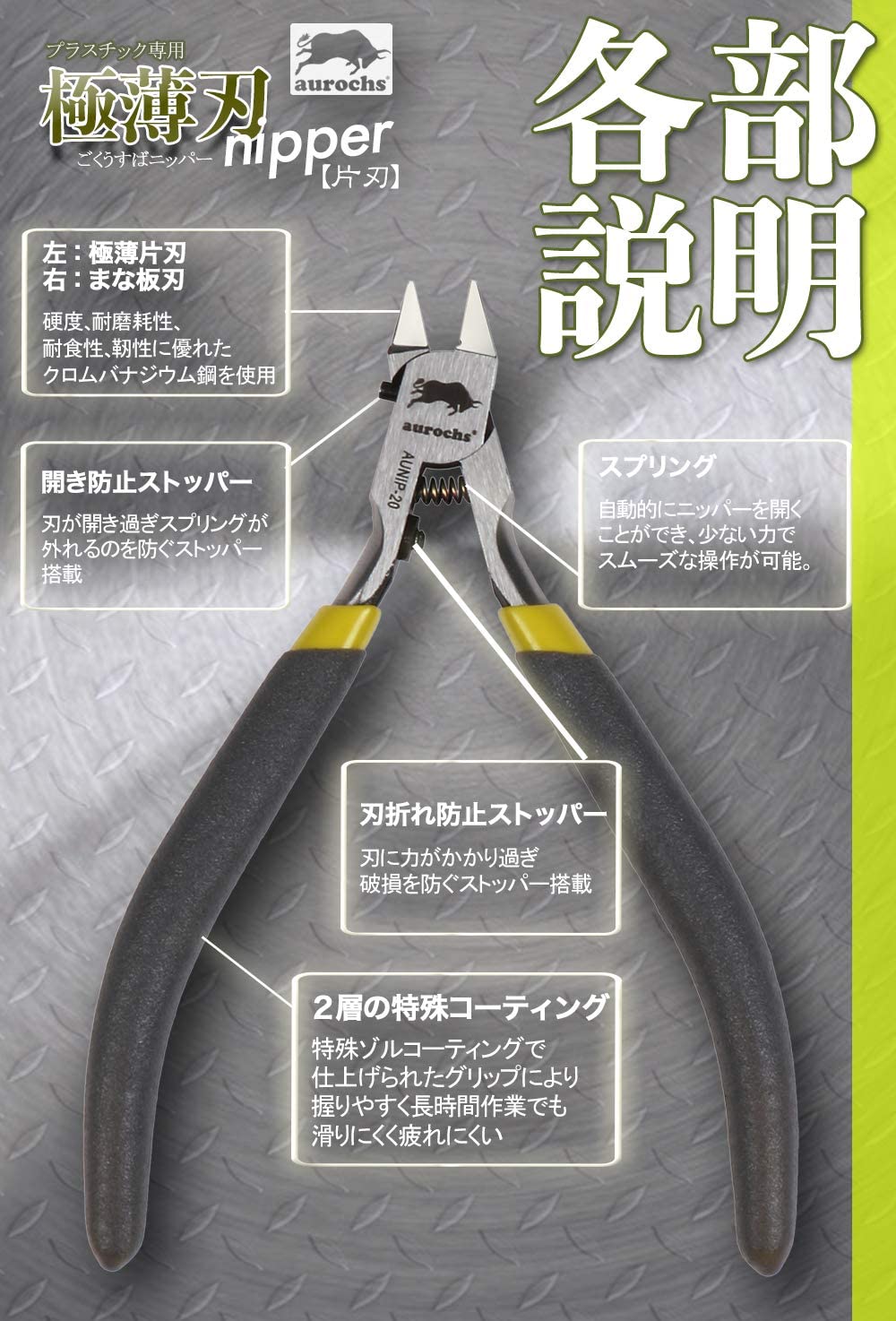 • aurochs 極薄刃 ニッパー 薄刃 片刃 工具 プラモデル グレー&ライム