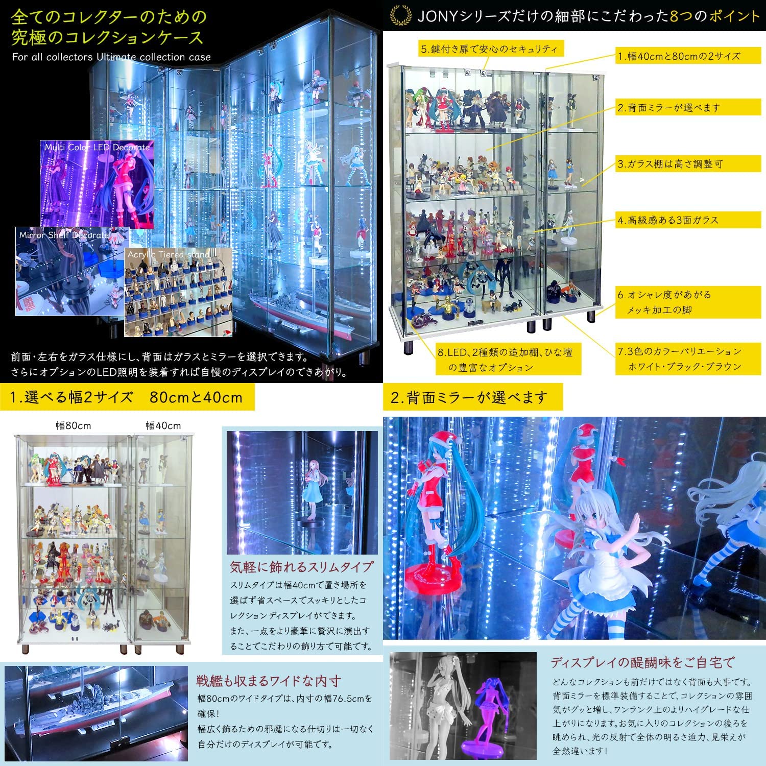 • ガラスコレクションケース JONY ジョニー 鍵付 ガラスケース ディスプレイラック 地球家具 コレクションラック (ガラスケース本体(スリム幅40cm ハイ)背面ミラータイプ, ホワイト) ※LEDは別売です