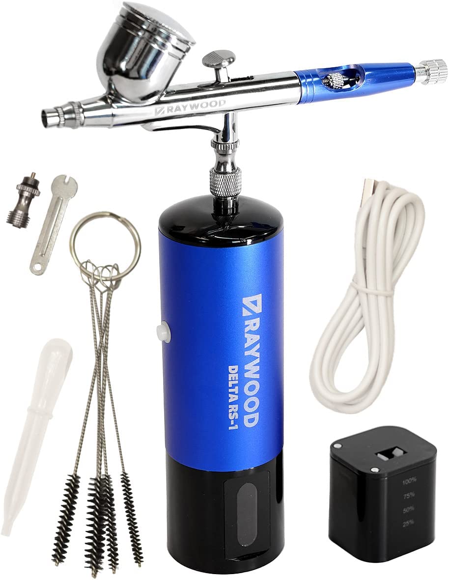 • RAYWOOD エアブラシ デルタ 充電式 コンプレッサー セット USB type-C ダブルアクション クリーナー 5本 付き 口径0.3mm 小型 プラモ 模型 塗装 アート クラフト (RS-1 アジュライトブルー)