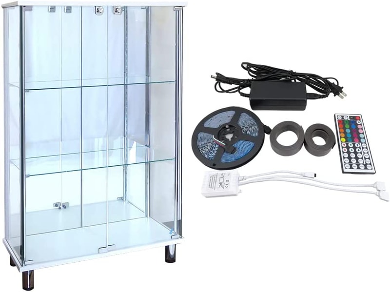 • ガラスコレクションケース JONY ジョニー 幅80cm スリム ミドル タイプ 鍵付 ガラスケース ディスプレイラック 地球家具 コレクションラック (高さ130cm ホワイト, 本体(背面ミラータイプ)+LED付)