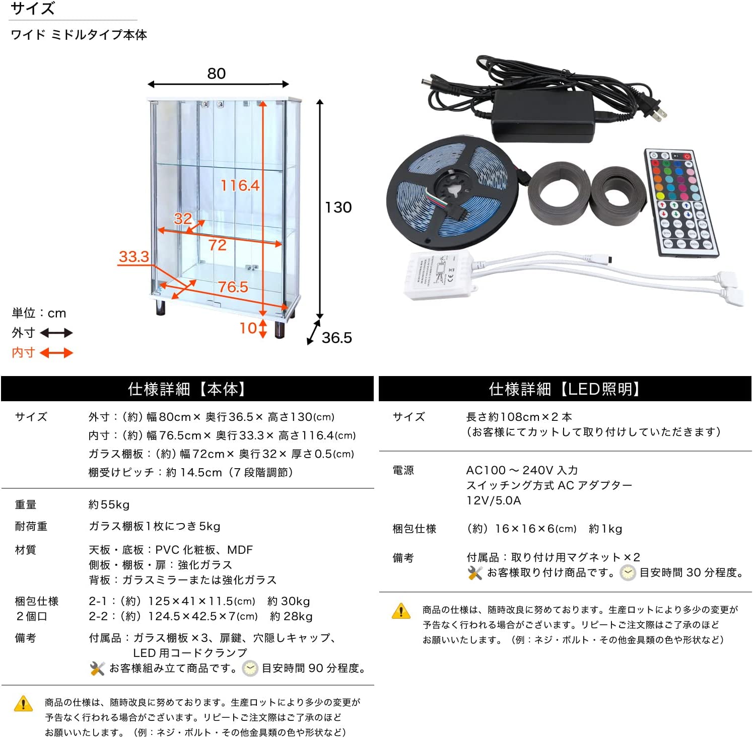 • ガラスコレクションケース JONY ジョニー 幅80cm スリム ミドル タイプ 鍵付 ガラスケース ディスプレイラック 地球家具 コレクションラック (高さ130cm ホワイト, 本体(背面ミラータイプ)+LED付)