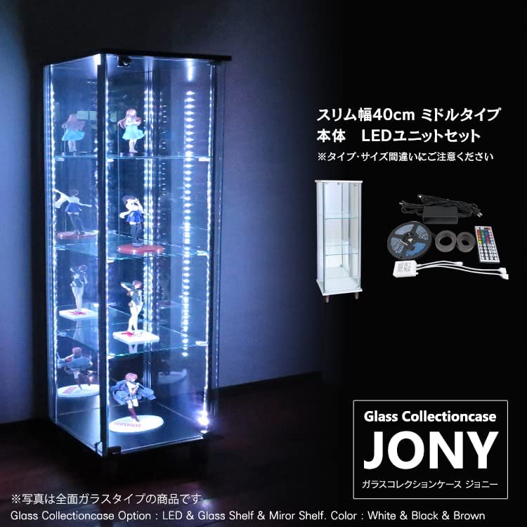 • ガラスコレクションケース JONY ジョニー 幅40cm 鍵付 ガラスケース ディスプレイラック 地球家具 コレクションラック (幅40cm ホワイト, 本体(全面ガラス)+LED付)