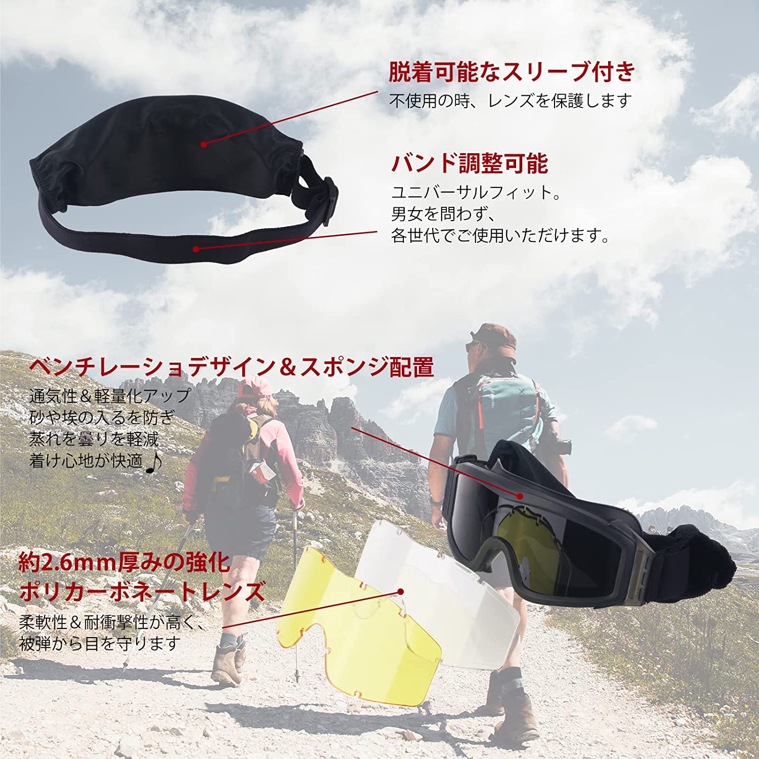 • FOCUHUNTER タクティカルゴーグル シューティンググラス スポーツメガネ 3色レンズセット 度付きレンズを付けれるフレーム&ストラップバンド付き