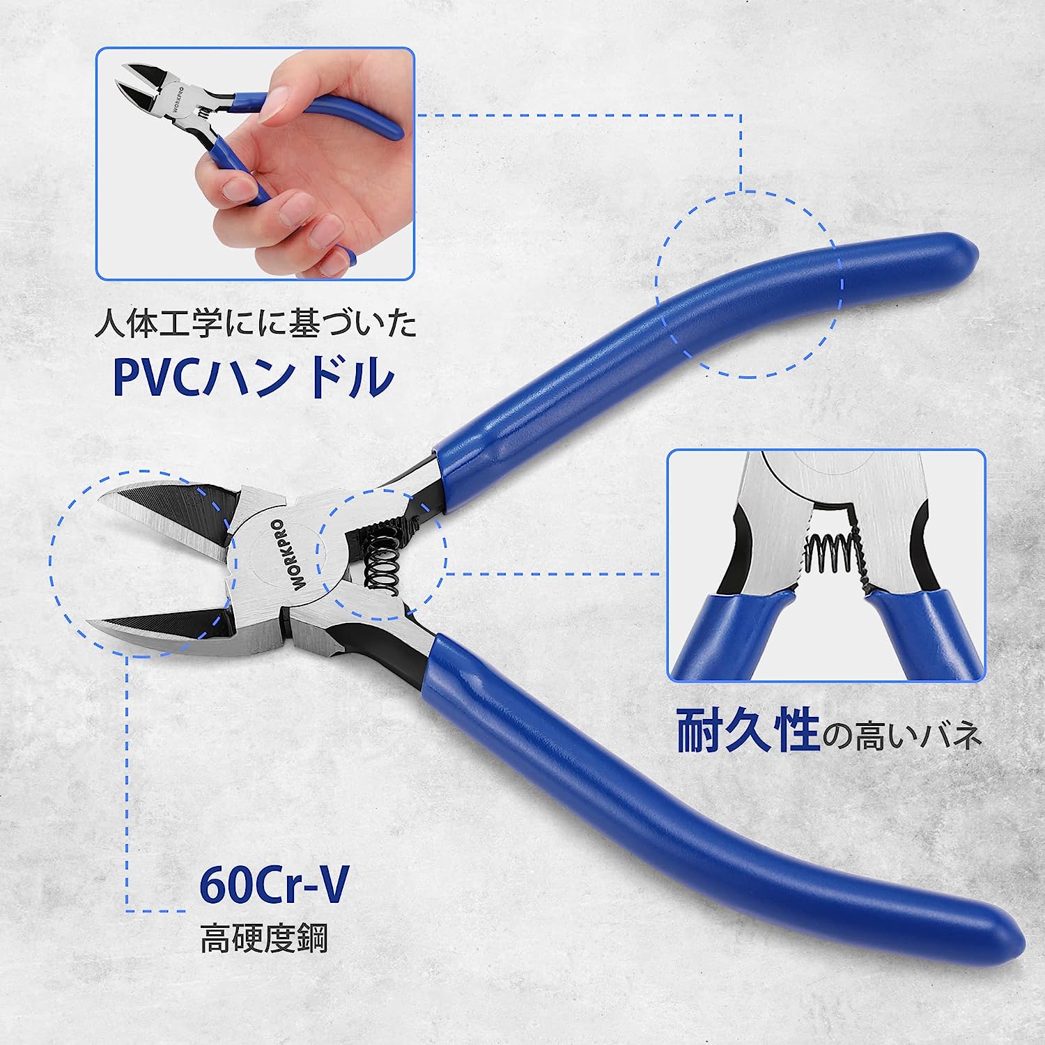 • WORKPRO 強力ニッパー プラスチックニッパー 115mm ミニニッパー バネ付 小型ニッパー 精密ニッパー 斜めプライヤー ワイヤーニッパー 軟鉄 銅線切断に DIY手作り プラモデル 手工業職人用 模型専用 繊細な作業工具