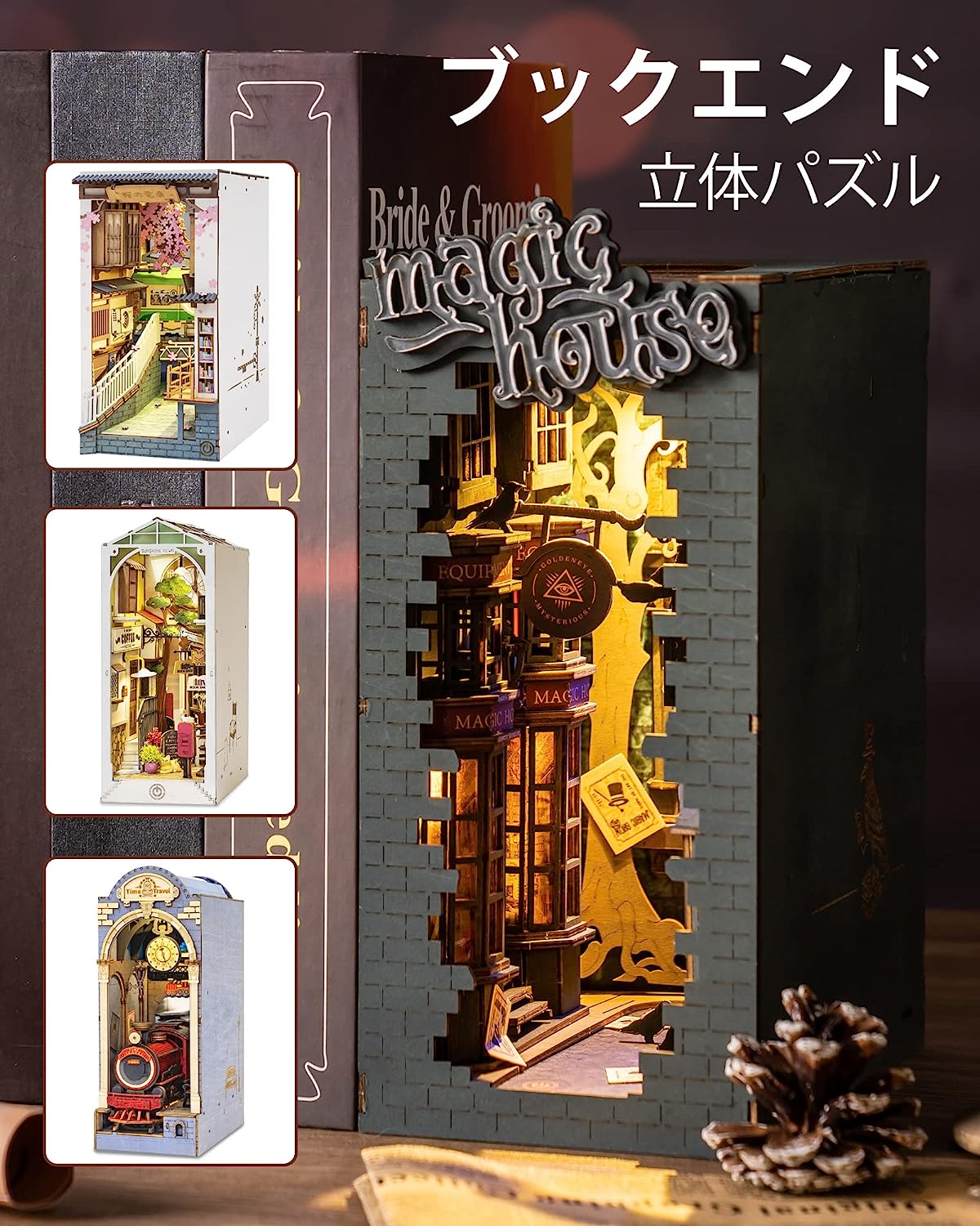 • Robotime 3D ウッドパズル DIY 木製 ブックヌークキット ブックスタンド LEDライト付き ミニチュアハウスキット (マジックハウス)