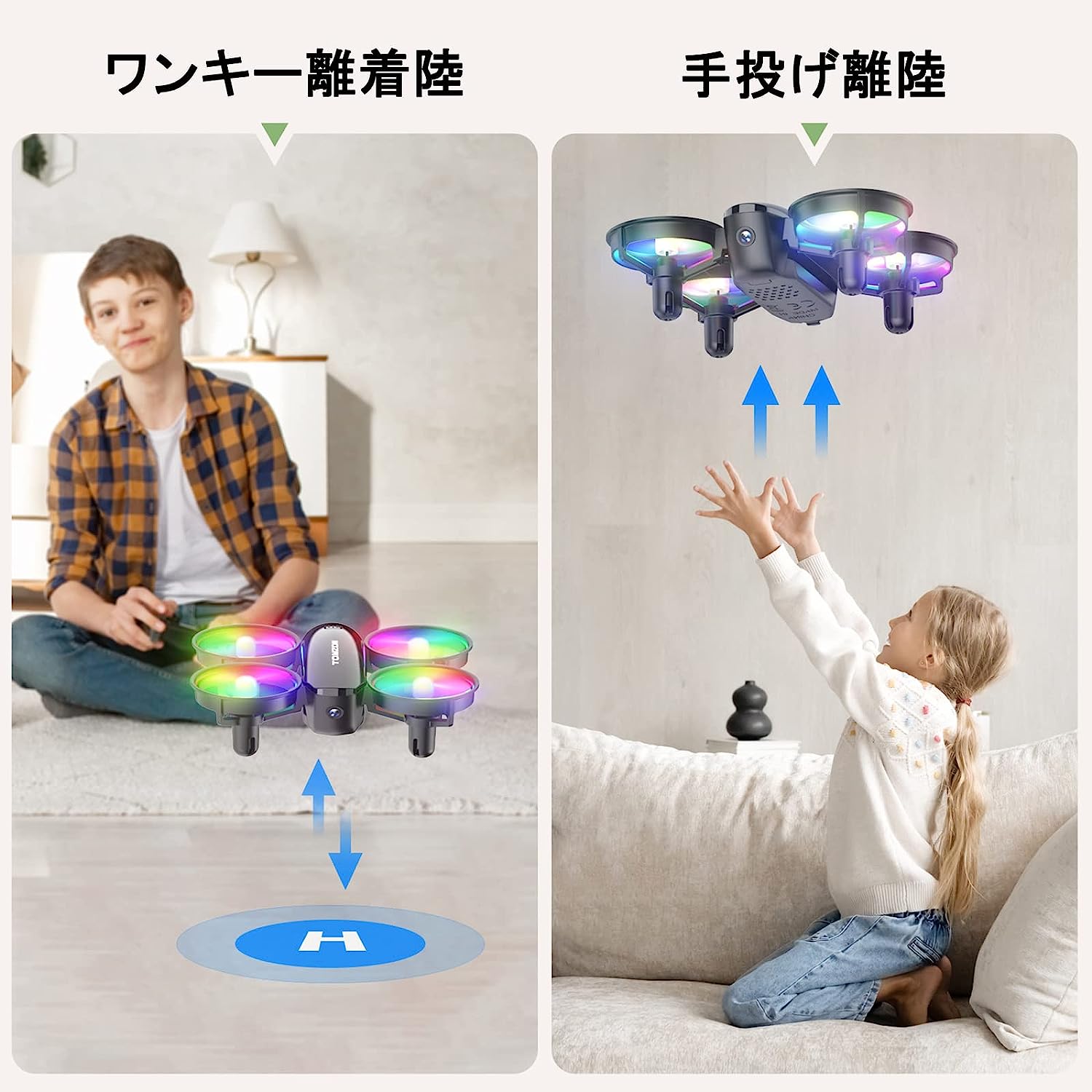 • ドローン カメラ付き Tomzon トイドローン 100g未満 LEDライト付き 子供向け 手投げ 放り投げ飛行 宙返り 高速回転 サークル飛行 ワンキー離陸 ヘッドレストモード スピード3段階 モード1/2切替可能 360°保護カバー 初心者 室内向け 小型 国内認証済み A23W