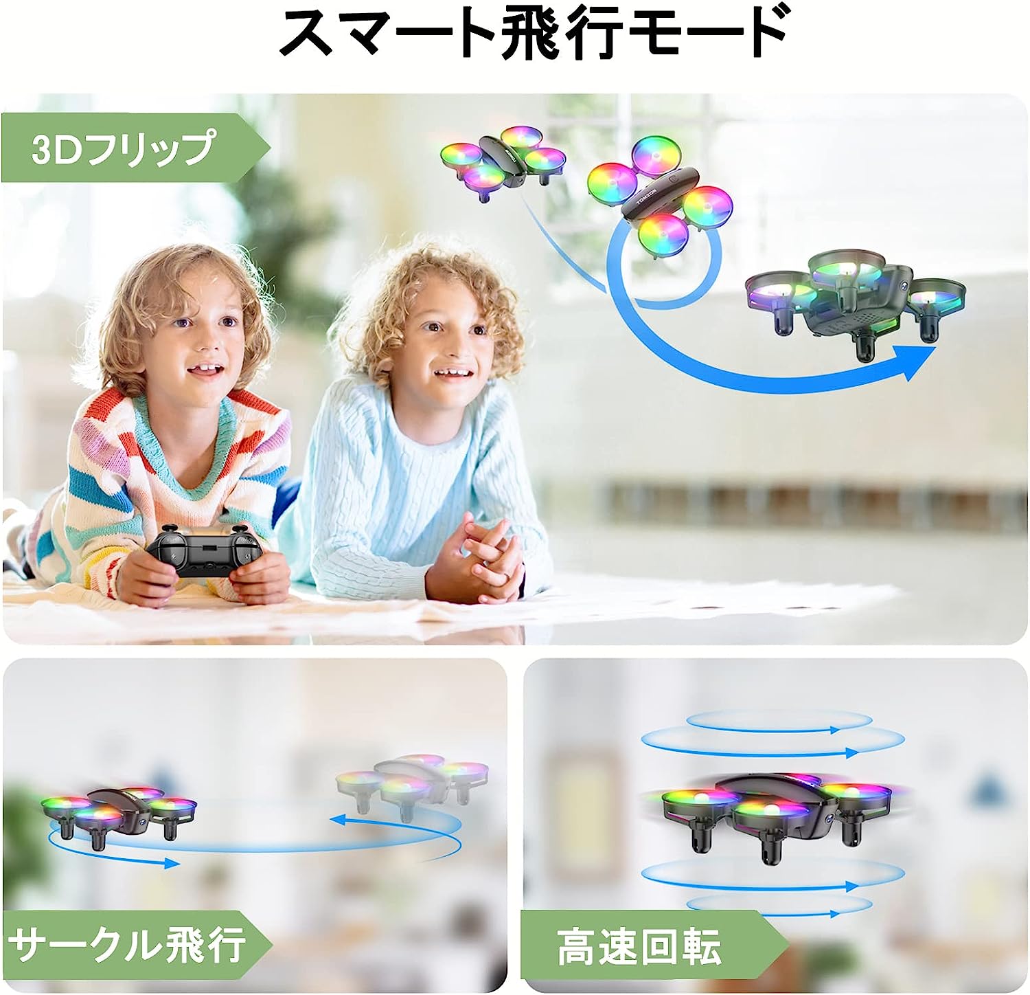 • ドローン カメラ付き Tomzon トイドローン 100g未満 LEDライト付き 子供向け 手投げ 放り投げ飛行 宙返り 高速回転 サークル飛行 ワンキー離陸 ヘッドレストモード スピード3段階 モード1/2切替可能 360°保護カバー 初心者 室内向け 小型 国内認証済み A23W