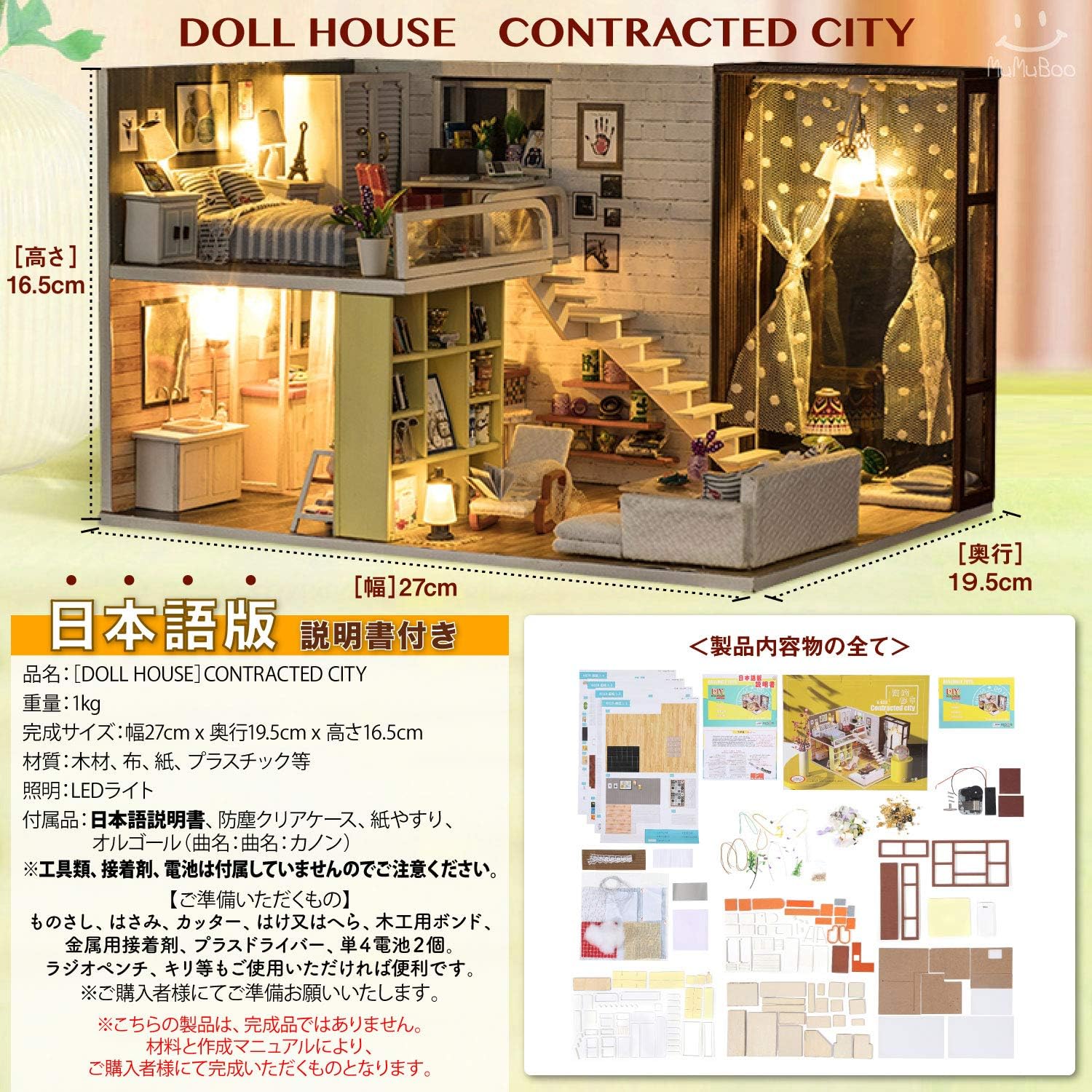 • [MuMuBoo] ドールハウス 日本語説明書付 手作り ミニチュアキット ミニチュア家具キット DIY 木製 【 LEDライト オルゴール 防塵用ディスプレイカバー 付属 】 (CONTRACTED CITY)
