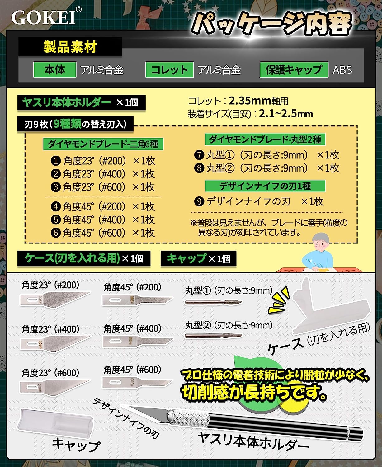 • GOKEI ダイヤモンドヤスリ 精密ヤスリ 【9種類の替え刃入 超硬極薄ヤスリ 0.6mm】 ホビー用ヤスリ ダイヤモンド電着ヤスリ バリ取り やすり プラモデル 工具 シャープナー 硬い素材の研磨 研磨 金属 ソフビ 細い プラスチック 面取り 仕上げ エッジ出し 面出し ゲート処理 やすりセット(ブラック)