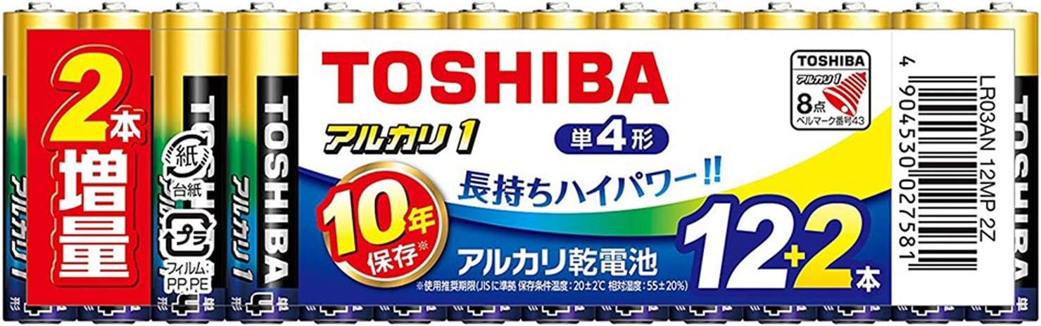 • 東芝(TOSHIBA) アルカリ乾電池 単4形 14本(12本+2本増量) 1.5V 使用推奨期限10年 液漏れ防止構造 アルカリ1 LR03AN 12MP 2Z