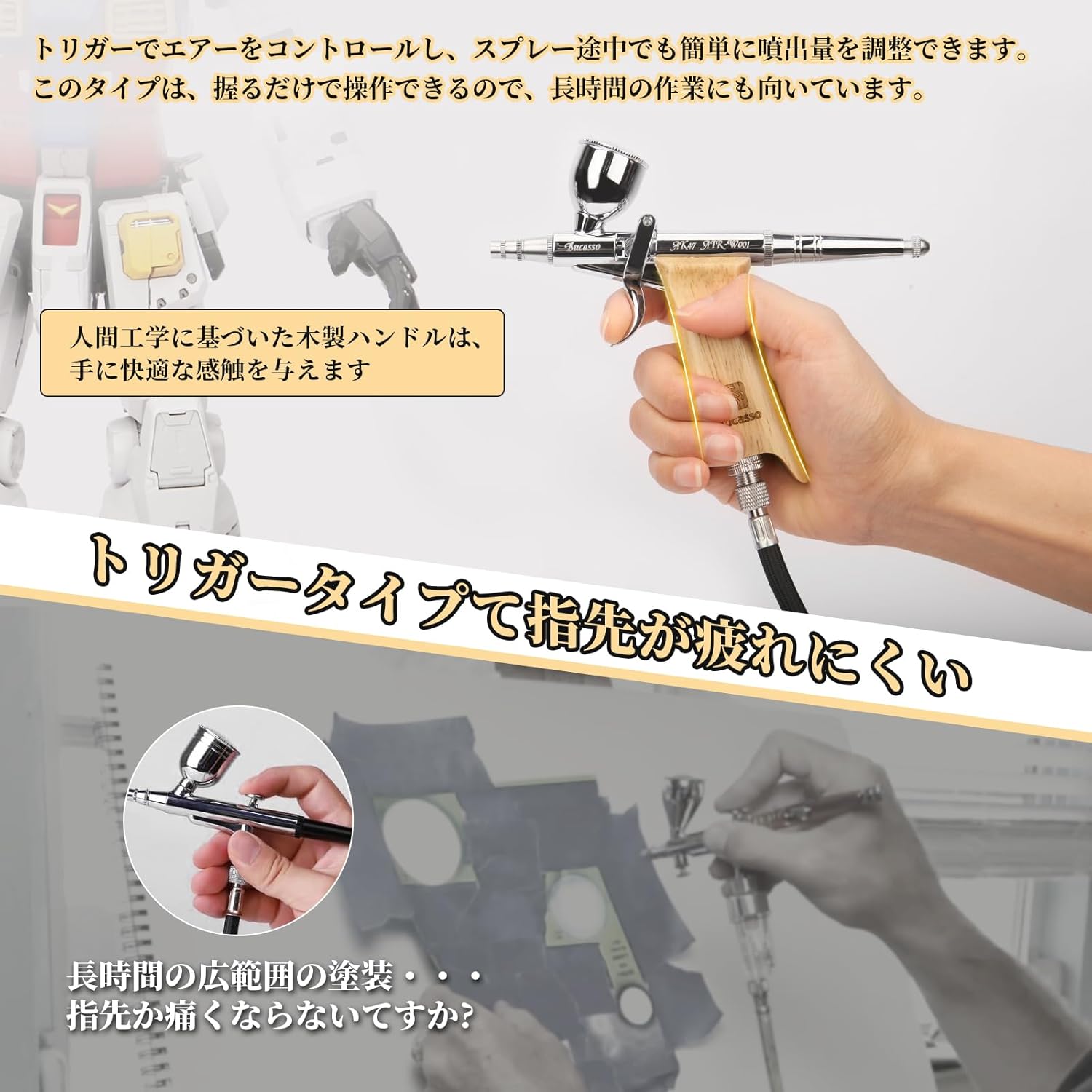 • 【2024年全新型】Bucasso エアブラシ ダブルアクション トリガー式 ハンドピース ヘッドアセンブリ交換可能 エアブラシキット 3種類ノズル 0.3mm 0.5mm 0.8mm 3種類カップ 3cc 7cc 11cc 塗装 プラモデル ホビー スプレー DIY (W001-Burlywood)