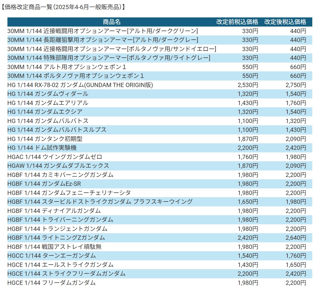 BANDAI SPIRITS、2025年4月よりガンプラなどプラモデル商品の値上げを実施(4/6)