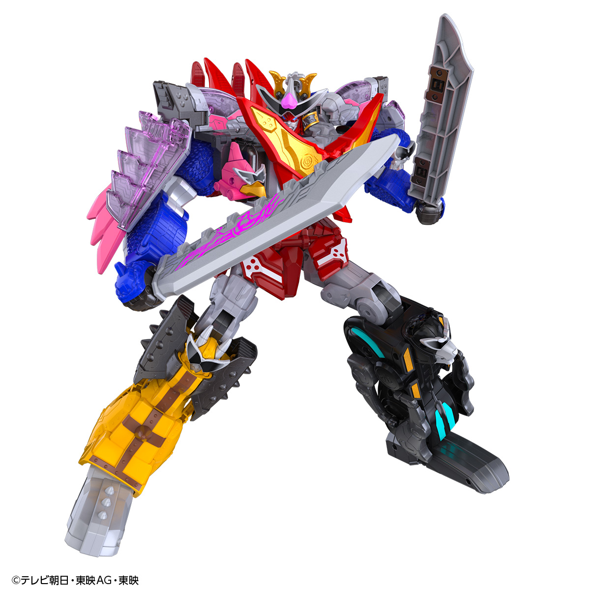 (C)テレビ朝日・東映AG・東映※別売りの「DX虎龍攻神」との合体は保証いたしません。※2023年発売「DXドンロボタロウ可動増強版&出陣オプションというセット」に付属した陣幕背景パーツ、ドンばい(軍配)、床几(椅子パーツ)や、2022年発売「DXドンオニタイジン」に付属したドンロボタロウは本商品には含まれません。