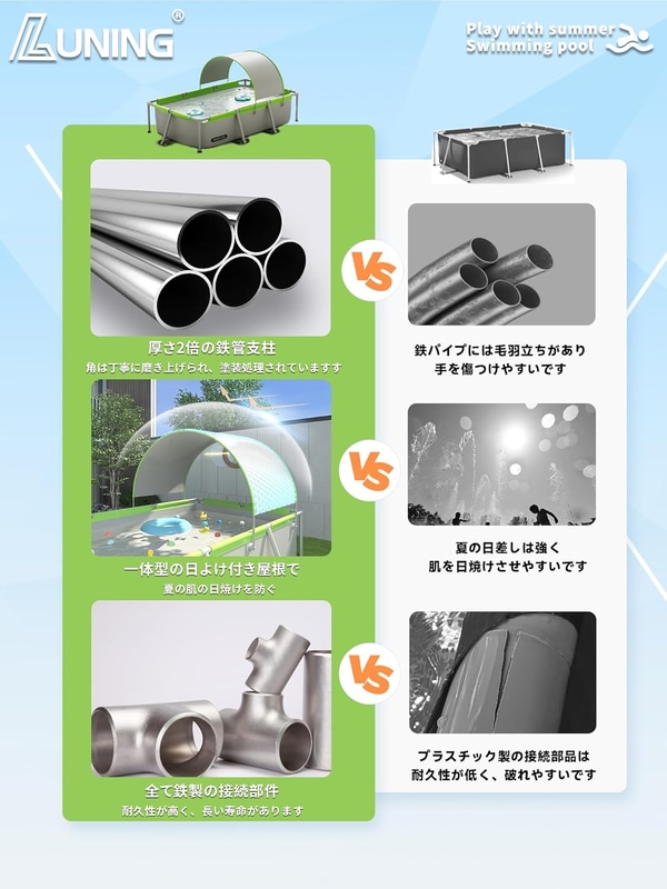 • LUNING【2025新登場 フレームプール】 屋根付き 大型プール 空気入れ不要 子供用 家庭用 耐高温 耐摩擦 紫外線遮蔽 猛暑対策 水遊び 簡易露天風呂 日本語説明書付き (外径490*242*84CM、内径436*208*84CM)
