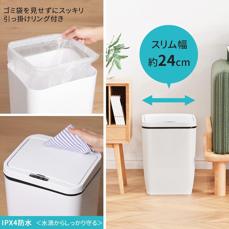 • 【スムーズに自動開閉】12L ゴミ箱 自動 ふた付き センサー付きゴミ箱 スリム 電池式 おしゃれ 幅24cm×奥行20cm×高さ34cm リビング 洗面所 IPX4防水 ごみ箱 コンパクト 白 12リットル