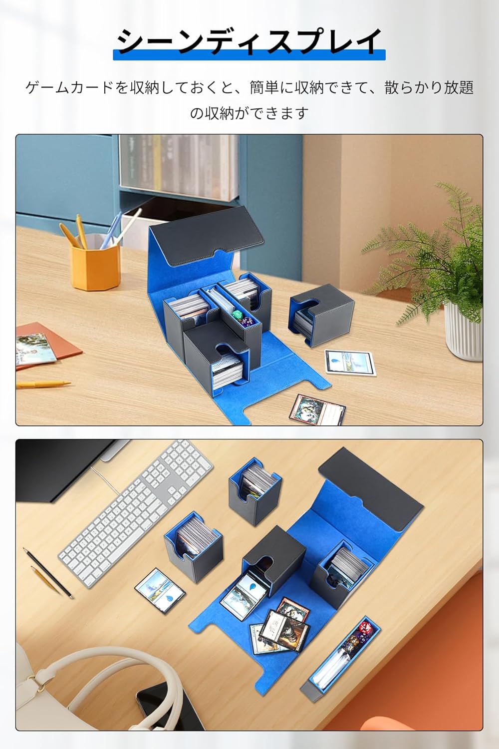 • HG CHASING TRIBE デッキケース トレカケース マグネットローダー 用 ケース PU レザー 23枚のマグネットローダーを格納できます カード450+枚収納 大容量 スリーブ対応 サイコロ付きケース トレーディングカードケース (黒、ブルー, 450+枚のカード組み合わせ収納)
